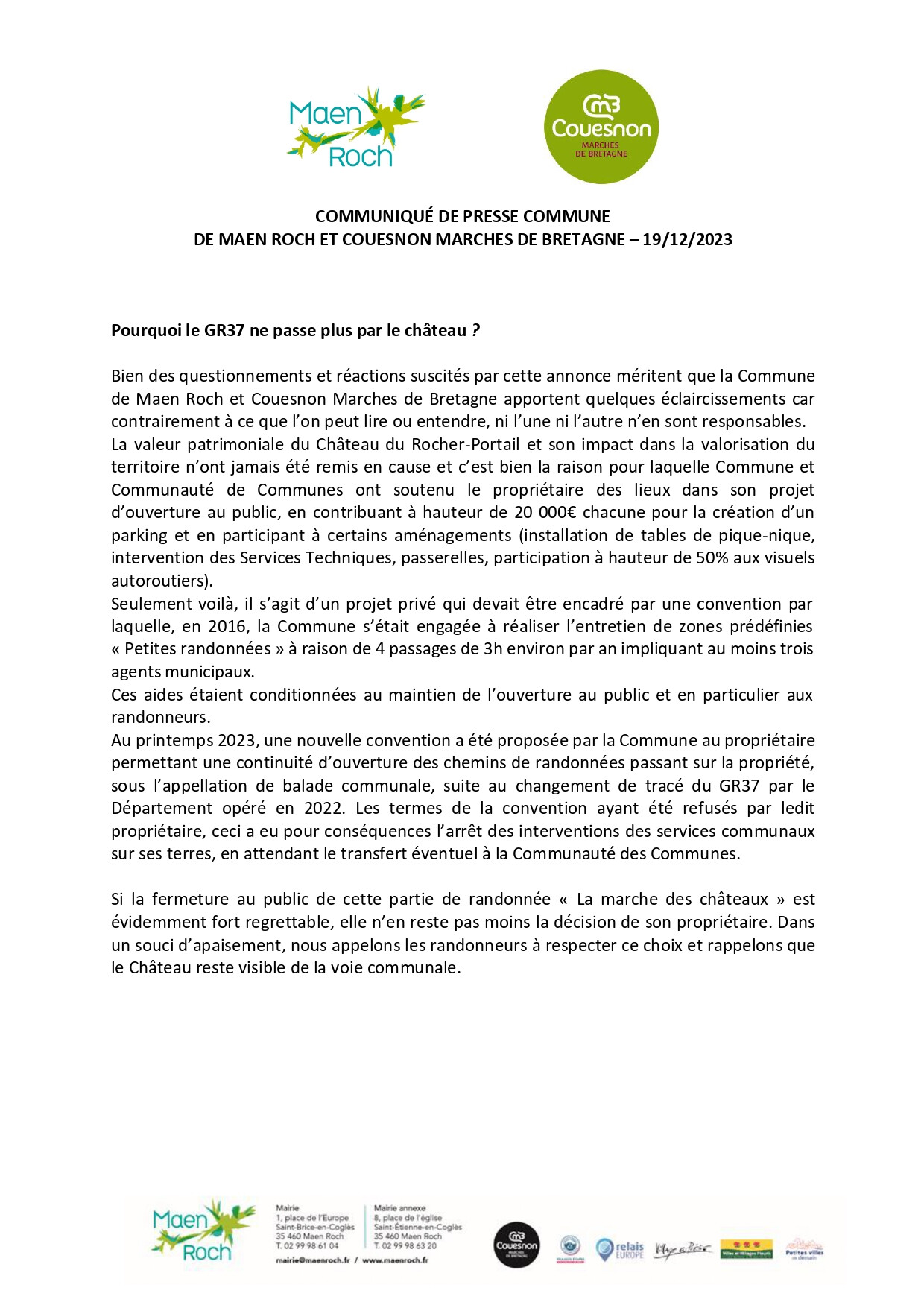 communiqué pressse mairie Maen Roch
